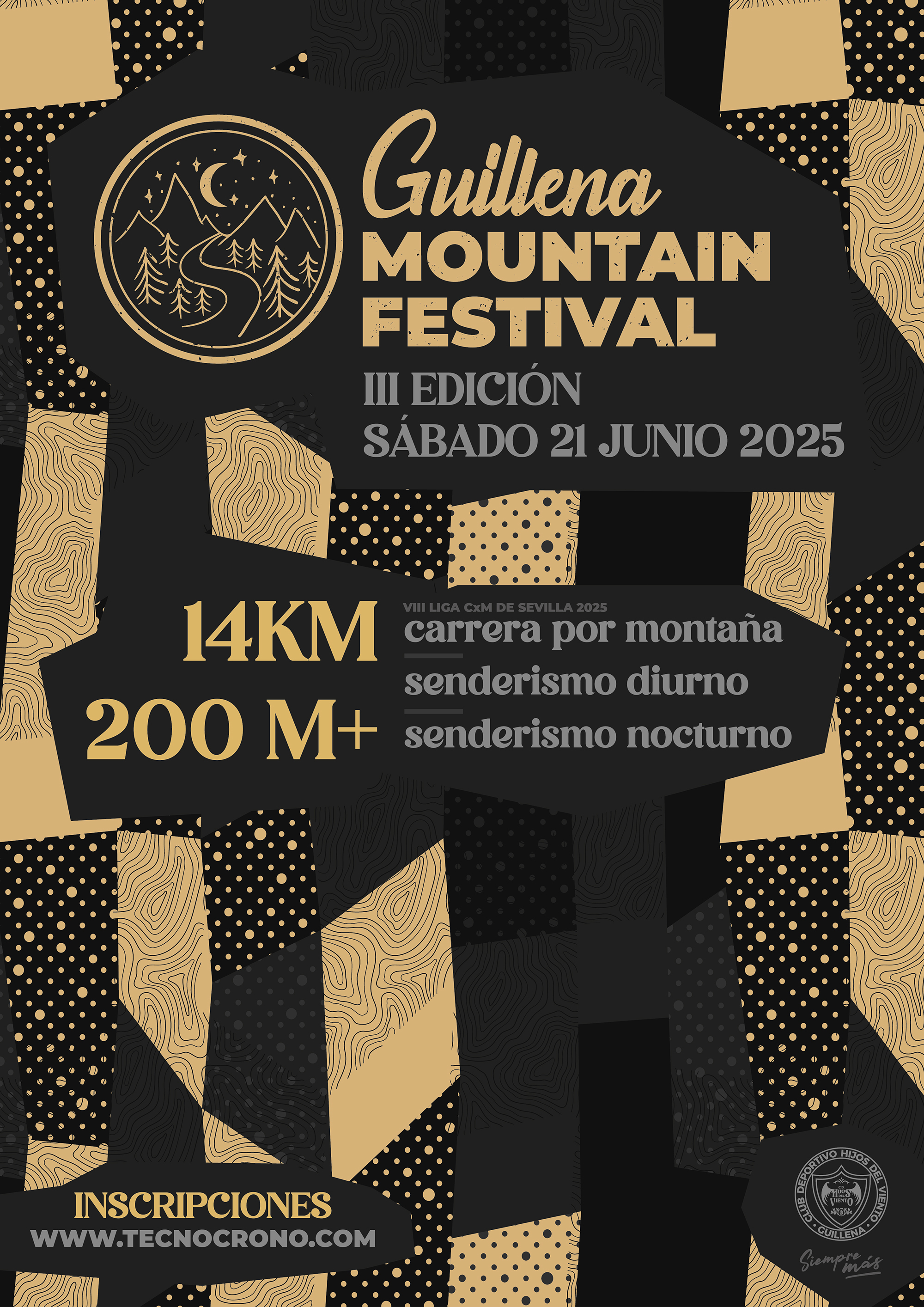 El Club Deportivo Hijos del Viento con la colaboración del Ayuntamiento de Guillena organizan el III GUILLENA MOUNTAIN FESTIVAL, que se celebrará el próximo sábado 21 de junio 2025. La prueba constará de una carrera nocturna de adultos, una carrera infantil y 2 senderismos, uno por la mañana y otro por la noche.